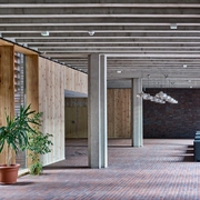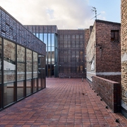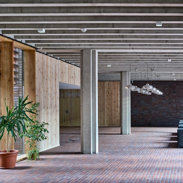 В конструкции использованы три основных материала - керамика, дерево и бетон, но именно первый, используемый в различных формах, определяет характер всего объекта. Обращает на себя внимание фасад, в который встроен фрагмент сохранившегося старого промышленного здания.