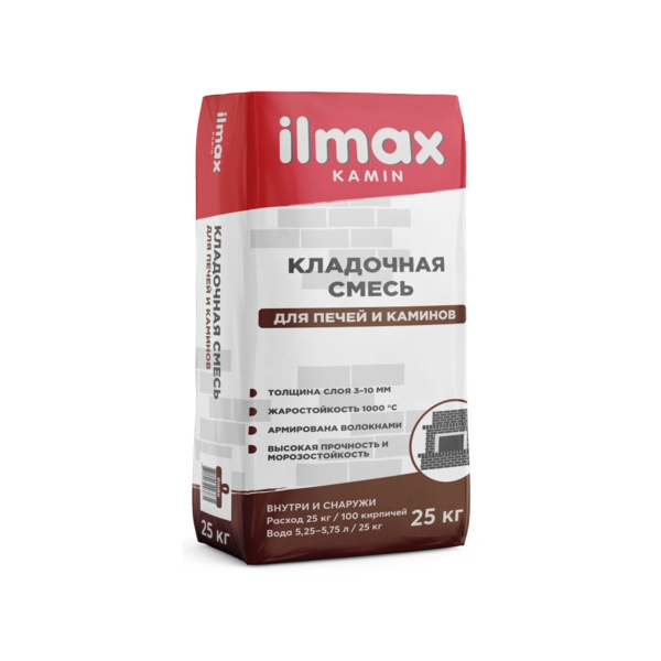 Кладочная смесь для печей и каминов ilmax kamin 25 кг предназначена для кладки конструкций, подверженных нагреву до 1000 °С (печи, камины, барбекю, мангальные зоны, тандыры), из шамотного (огнеупорного) и печного кирпича.