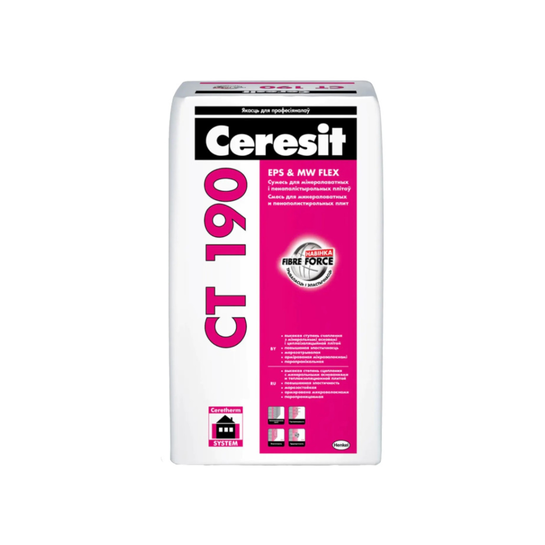 Клей для теплоизоляции Ceresit CT 190 КС1 25 кг применяется для монтажа минеральная ваты и пенополистирола к бетону, блокам, кирпичу и штукатурке, а также используется для устройства армированного слоя при утеплении.
