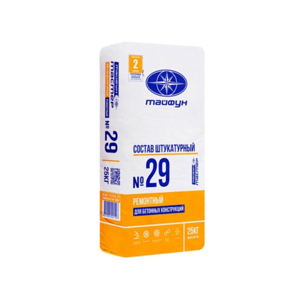 Штукатурка Тайфун Мастер №29 ремонтная для бетонных конструкций – материал для внутренней и внешней отделки здания, предназначен для выравнивания строительных конструкций, устраняет дефекты стен, трещины и другие изъяны. Имеет высокие показатели прочности, хорошую устойчивость к влаге и длительный срок эксплуатации, поэтому используется широко практически на любом этапе стройки, от внутренней отделки и до фасада. Славится также своей универсальностью, подходит под разные поверхности: блоки, кирпич, бетон, некоторые теплоизоляционные материалы и др.